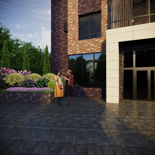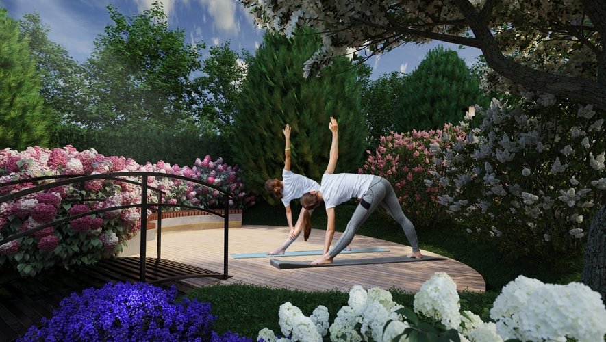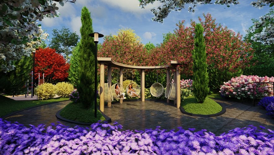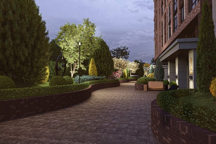 Крупномерные деревья, кустарники, даже травянистая растительность будет сочетаться вне зависимости от времени года. Двор расцветает в мае, насыщен зеленью летом, золотыми оттенками — осенью, а зимой его украшают снежные шапки снега на кронах деревьев.
